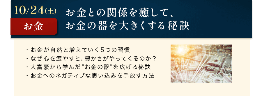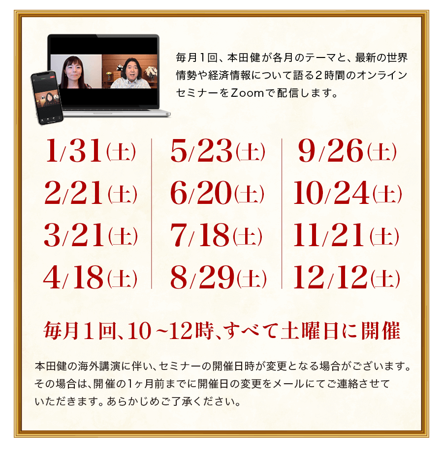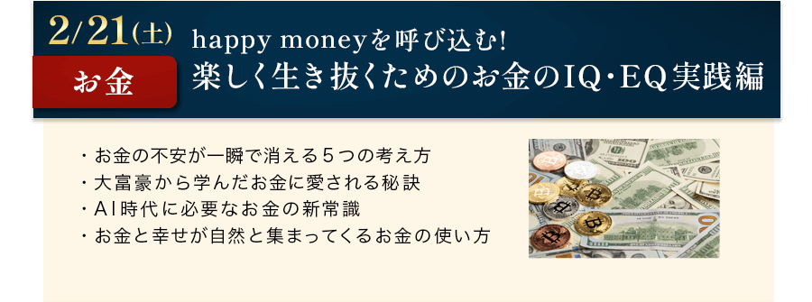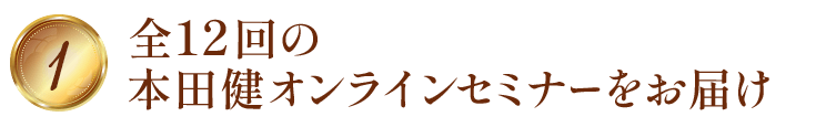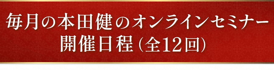 本田健から直接学べるオンラインセミナーを、毎月2時間、全12回に渡り、お届けします。幸せで豊かな人生を生きるために必要な知識と知恵を、1年かけてあなたの心と身体にインストールしていただきたいと思います。また、本田健独自の情報収集能力で得た世界情勢に関する情報もお伝えします。