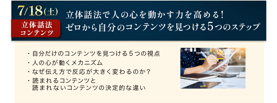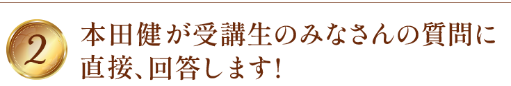 毎回大人気の、本田健がセミナー受講生の皆さんからの質問に『立体話法』で答える質疑応答の時間も設けます。自分の才能の見つけ方、集客の方法、作家としてのポジショニング、お金の器を癒すといった様々な課題を扱います。本田健とのやりとりを聞いているだけでも、たくさんの気づきを受け取っていただけると思います。