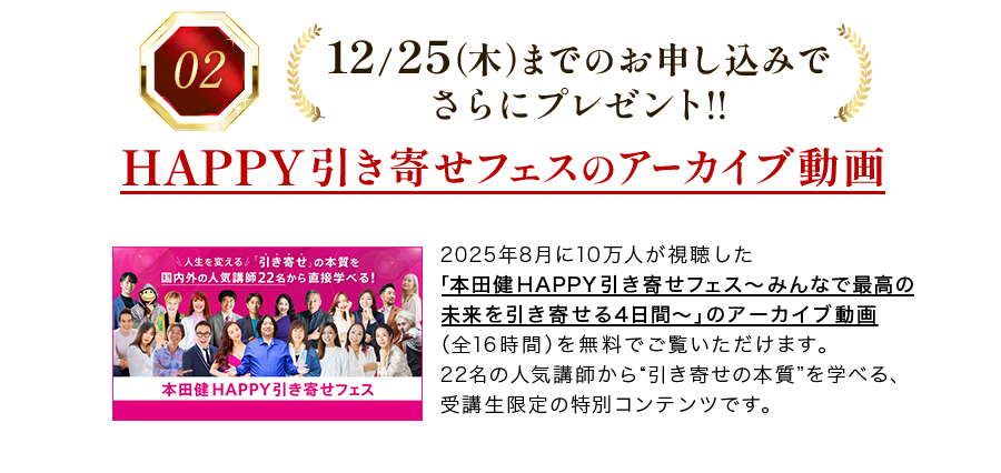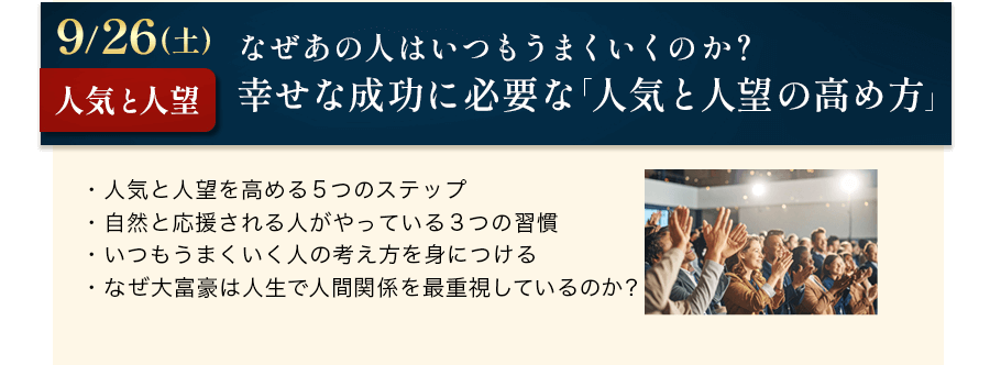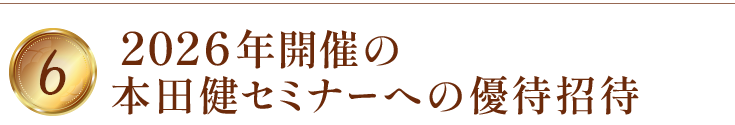 2026年に開催するアイウエオフィス主催の本田健オンラインセミナーやリアルセミナー、合宿セミナーに、優待価格でご参加いただけます。優待対象となるセミナーの開催が決定次第、メールにてご案内させていただきます。本田健からもっといろんなテーマについて学んでみたいという方にオススメです。