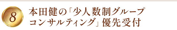 毎回満席となる本田健の「少人数制グループコンサルティング」へ優先的にご案内させていただきます。たった15分という短い時間で、その人の人生を大きくシフトするきっかけを与えることができると、本田健は言います。このセミナーでは、一人ひとり時間をとり、参加者全員からの質問に、本田健がもれなくお答えします。開催が決定次第、メールにてご案内させていただきます。