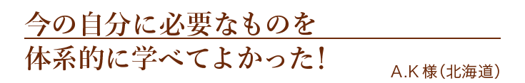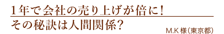 会社の売上をあげたい、と思い参加しましたが、人間関係の気づきが一番大きかったです。家族や社員との人間関係でそうだったのか!という気づきがたくさんありました。ビジネスと人間関係は別物と思っていましたが、人間関係への理解が深まると、家族や社員との関係も改善し、気づけば会社の売上が1年で倍になりました。ありがとうございました!