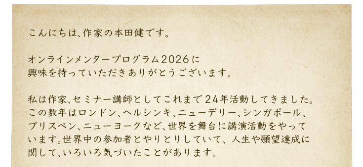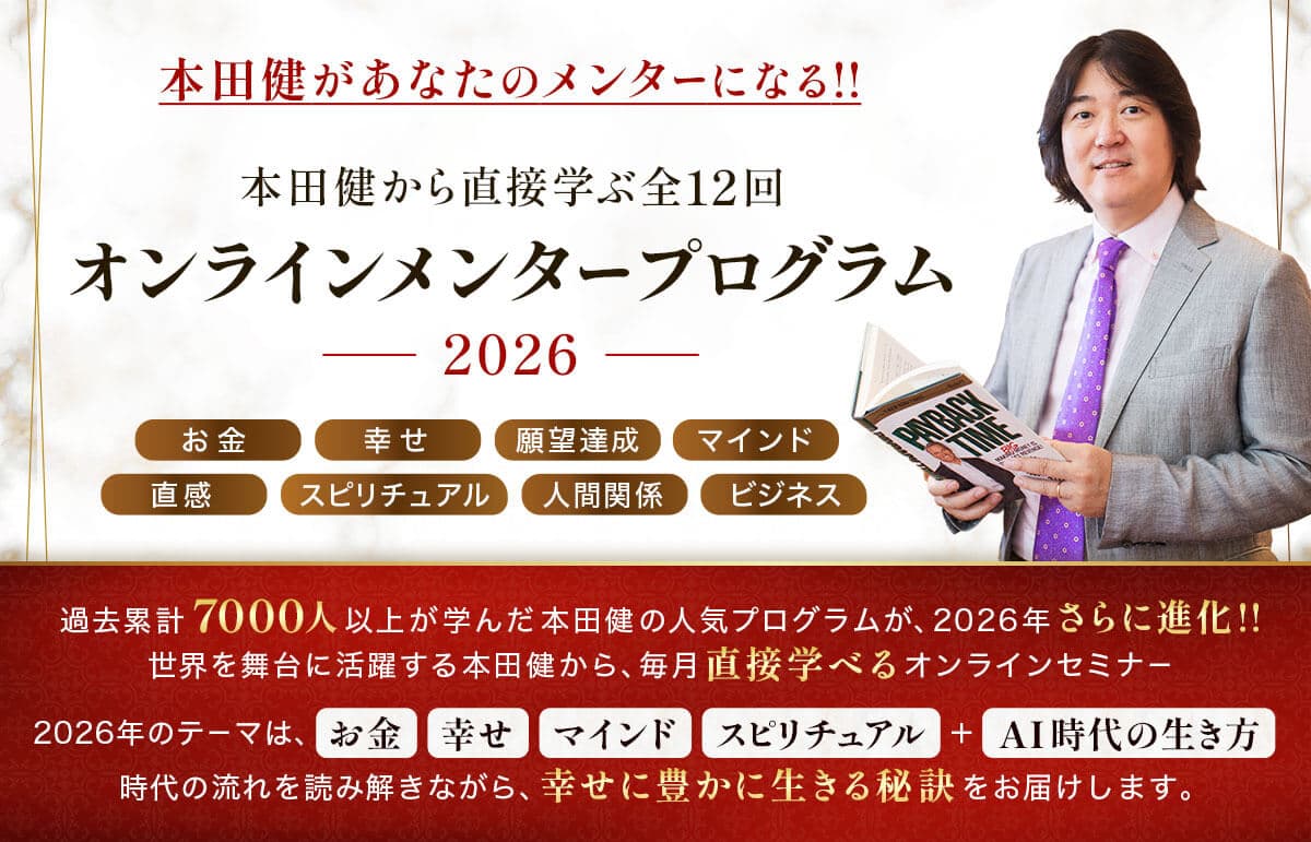 しかし、日本語での活動をやめてしまうわけではありません。逆に、海外に出ている分だけ、本田健の日本愛は増している、と言います。そして、日本語で教えられる喜びも、日本人対象のイベントをやるたびに感じるそうで、2026年も、日本語で1年コースをやることになりました。内容は、願望達成や人間関係、スピリチュアル、お金、仕事、ライフワーク、才能の見つけ方など、多岐にわたります。