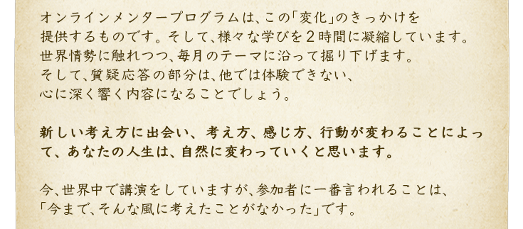 ここまで読んで、あなたが少しでもワクワクを感じたのなら、このオンラインメンタープログラムは、あなたの未来を、これまでの延長線上の未来から、幸せで豊かな方向へと導いてくれるきっかけになることでしょう。