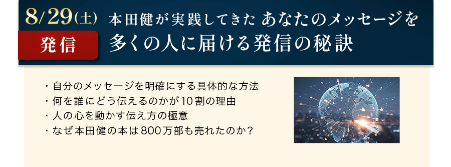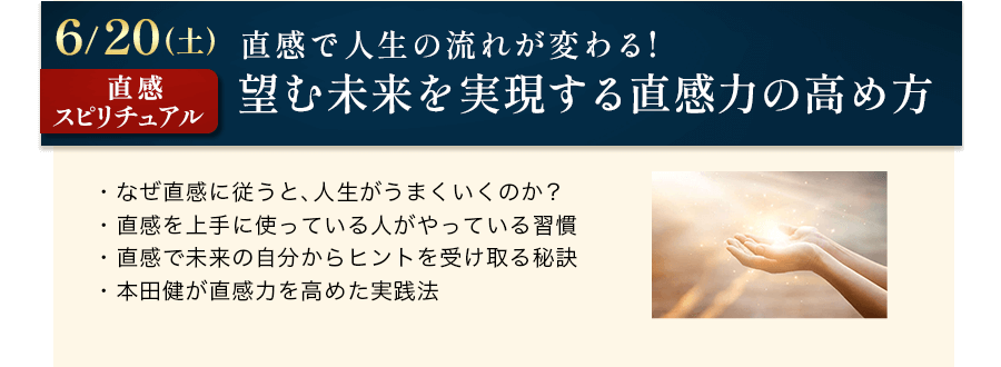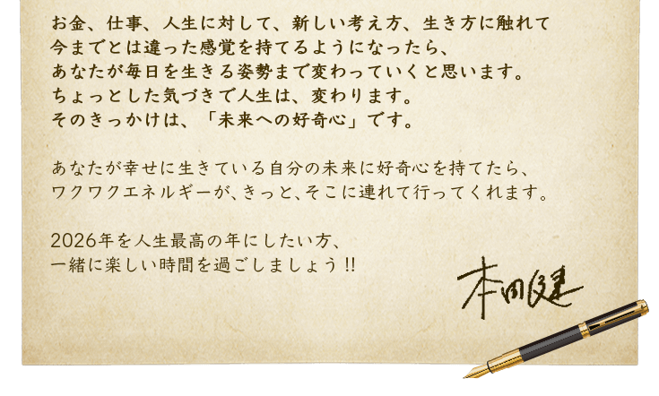 幸せで豊かな人生を実現するためには、お金やビジネス、人間関係だけでなく、目に見えない直感、スピリチュアル、そして感情のことなど、様々な要素を学ぶことが欠かせません。作家としてデビューして四半世紀に渡り活動し、たくさんの人の人生を変えてきた本田健と繋がり、直接学ぶことで、あなたの人生にはどんな変化が訪れるのか、よかったら想像してみてください。