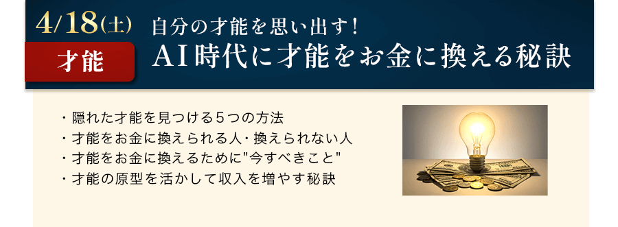 変えていきたい!という方のための1年間プログラムです。 本田健があなたのメンターとなり、12回のオンラインセミナーを通じて、幸せに自由に生きるための秘訣をお伝えします。 毎月、願望達成、お金、仕事、人間関係、才能の見つけ方など、AI時代に幸せに生きるために必要な情報を本田健が誰にでもわかりやすくお話ししていきます。